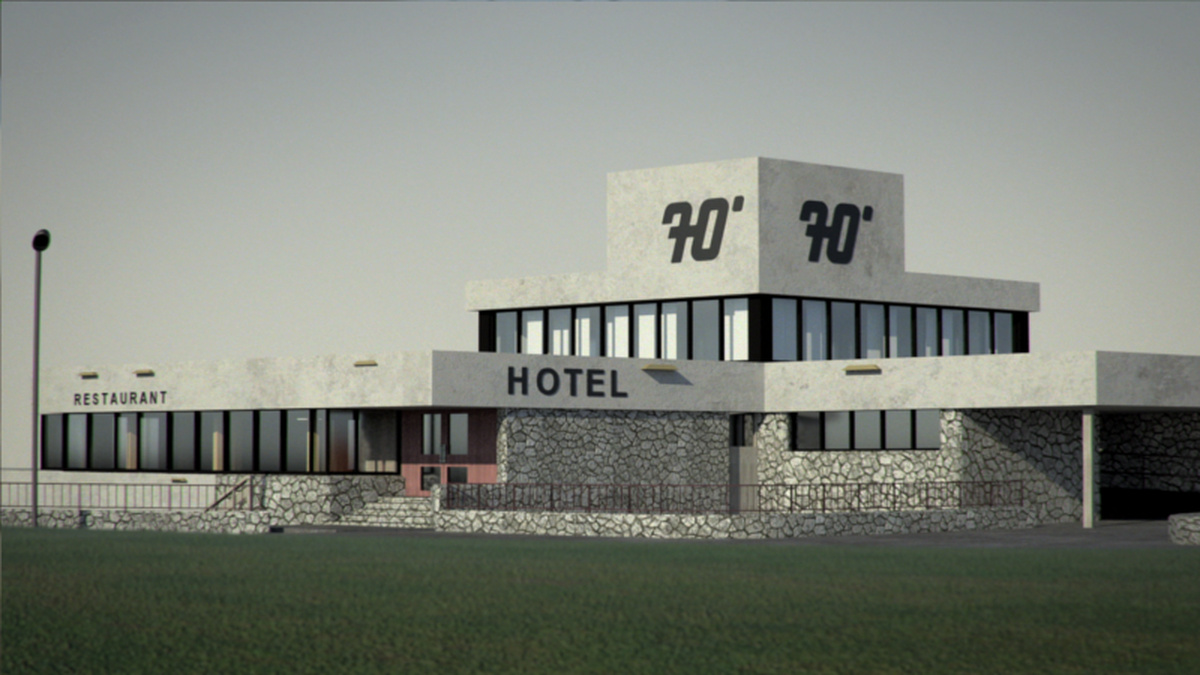 'Hotel 70°' (Bedwyr Williams, 2014, 16 min, Wales, UK) features a replica of the iconic Hotel 70 Degrees, which stood on the cliff near Colwyn Bay, Wales, and became notable for its peculiar architecture with corners angled to 70 and 110 degrees.