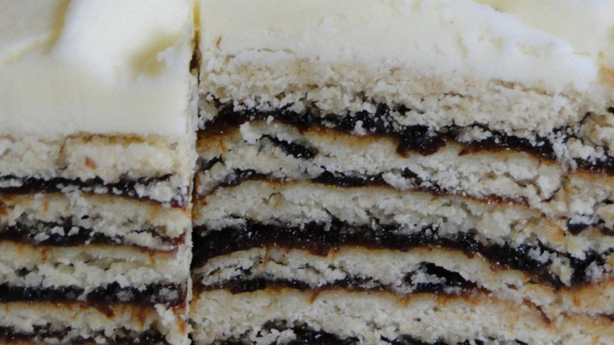 Made with prunes and cardamom, vínarterta is an Icelandic cake with a Viennese name that is more popular today among North Americans with Icelandic heritage than in its home country. Vínarterta is often misspelled (vinartarta or vinaterta), but as sometimes happens in the diaspora, preserving the original Icelandic recipe was a priority in North America whereas in Iceland the recipe evolved. There bakers might use rhubarb or strawberry for the filling - in Canada the prune filling, however, is law; and, like any law, there are different interpretations, which spark heated debates. Icing or no icing? Cardamom or cinnamon in the prune jam? Six layers or seven?