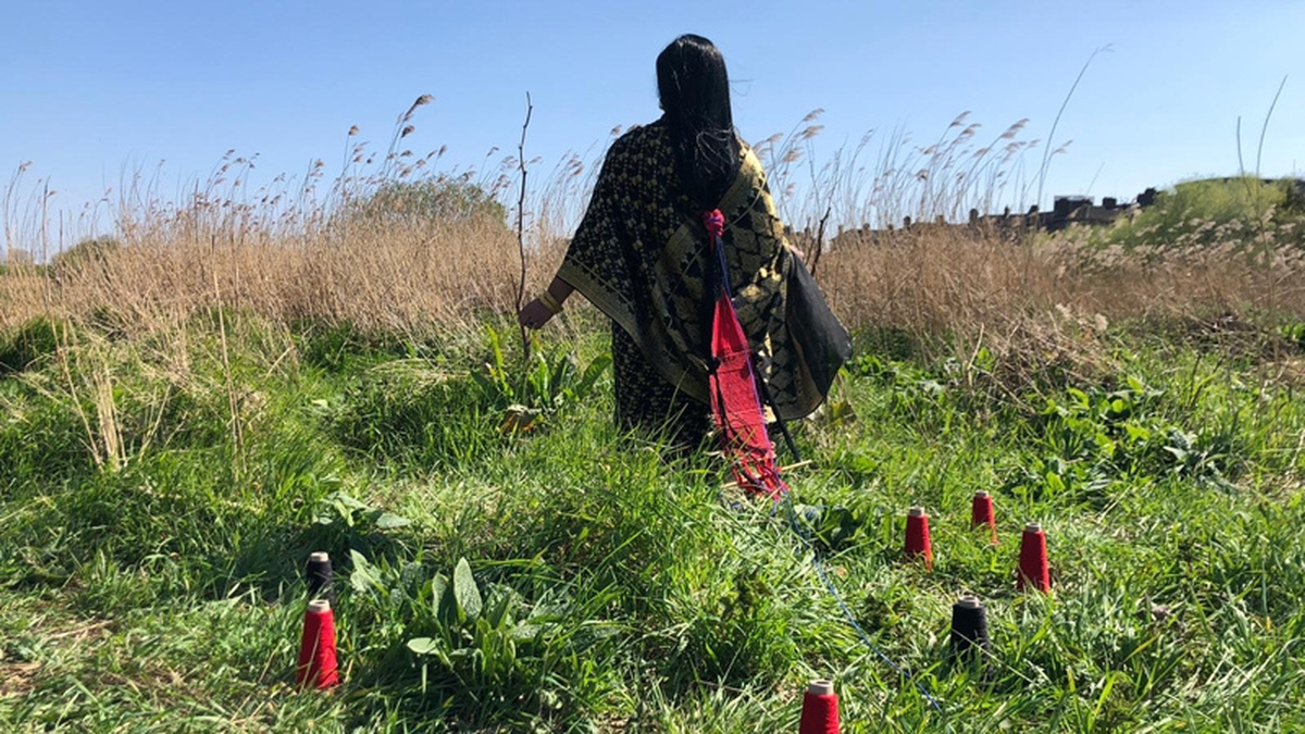 The sculptural weaving, which features in the moving portrait, acts as a consequent reminder of the colonial imposed borders and the ongoing conflict between India and Pakistan.