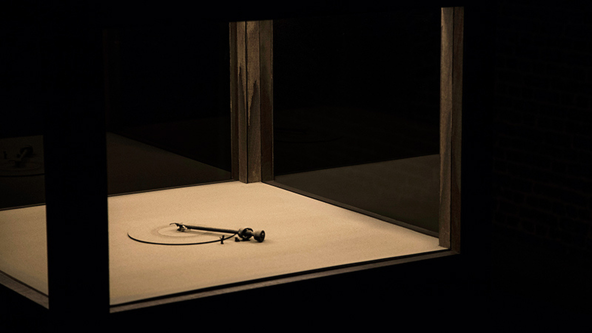 A single record, Carl Reinecke’s plaintive Elegie, plays on a turntable encased in glass, while a fine trickle of ash – like the detritus of disaster, or the harbinger of a great collapse – falls steadily down on the vinyl. Over the course of playback, the buildup of dust first gently then more insistently interferes with the music, until the quantity is so great it overwhelms the record-player’s needle and the turntable falls silent.