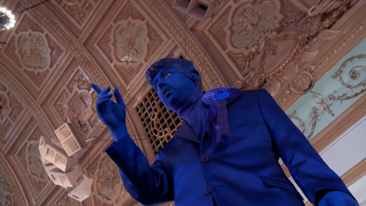 The Unspeakable Freedom Device is an experimental narrative film by artist Jennet Thomas, originally commissioned as part of a solo exhibition for the Grundy Art Gallery, Blackpool. The film presents a kind of absurd fairy-tale, in which a strange mythical tribe surrounding the ‘Blue Lady’, based on a memory of former Prime Minister Margaret Thatcher, holds sway. The tribe takes a fictional pilgrimage through a future-primitive world, where the difference between magic and technology is now forgotten.