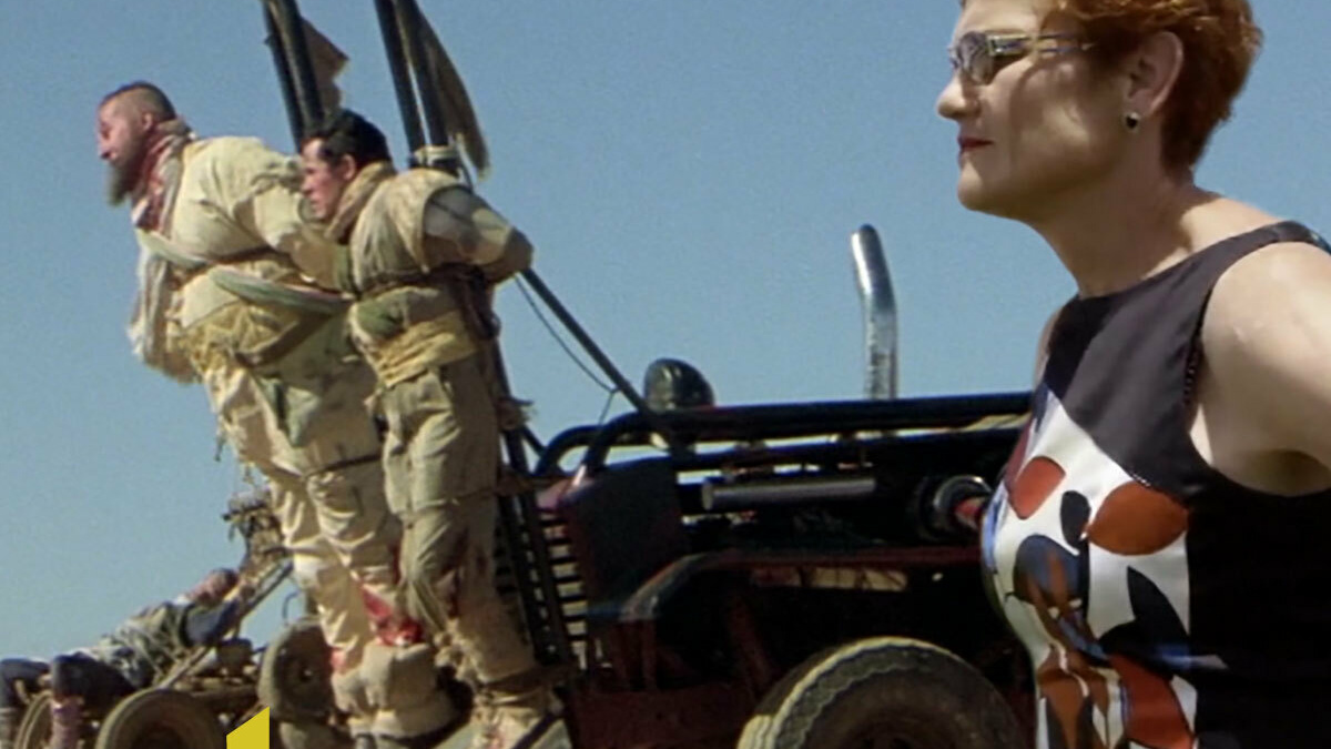 Part political satire, eco-horror and road movie, Terror Nullius is a political revenge fable constructed entirely from samples pirated from the Australian cinema canon. Binding together a documentary impulse with speculative muckraking, Soda Jerk’s feature remix offers an incendiary un-writing of Australian national mythologies. The apocalyptic desert camps of Mad Max 2 become the site of refugee detention, flesh-eating sheep are recast as anti-colonial insurgents and the women of Australian cinema go vigilante on Mel Gibson.